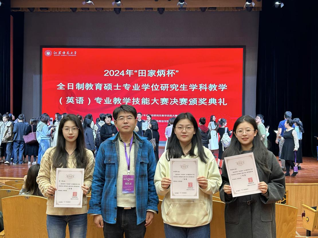 2024年11月9至11月10日,全国“田家炳杯”全日制教育硕士专业学位研究生学科教学(英语)专业教学技能大赛决赛暨新时代学科教学(英语)专业硕士人才培养研讨会在江苏师范大学成功落下帷幕。我院共有3名学生进入决赛,共收获一个二等奖和两个三等奖,我院孟令新老师荣获“优秀指导教师奖”。