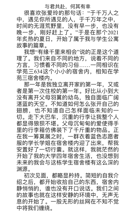 活动一经发布,学生们踊跃报名参与,展现出米兰体育网页版学子的昂扬风貌。学生们以个人为单位,以他们与公寓的精彩故事为主线,凭借着积极饱满的心态与宿舍深厚的感情,下笔成章,行云流水,完成了作品。在征文中有奋斗拼搏的宿舍生活,有保护宿舍环境的举动,也有对未来宿舍发展美好的憧憬……这些作品不仅流露出学生们的真情实感,也展现出了宿舍文化对学生们的深刻影响。征文《血染红旗,志燃紫藤》中讲到“公寓的生活承载着我们太多太多的记忆,公寓的故事我们一读再读,永远不会厌烦,永远不会觉得无趣。因为这是我们的青春。”生动展现出宿舍舍友之间相伴的温暖。征文《与君共赴,何其有幸》中“公寓让我卸下了对陌生新环境的戒备,不再排斥异乡的月光,不再纠结故乡的夕阳。别桑梓的鹤也终于沐浴在春风里,汇溪流的河也终于融合在山谷之中。”向舍友们表达陪伴是最长情的告白,深情的话语令人感动。其后,评审人员通过公平的投票机制,评选出一等奖2名,二等奖3名,三等奖5名。