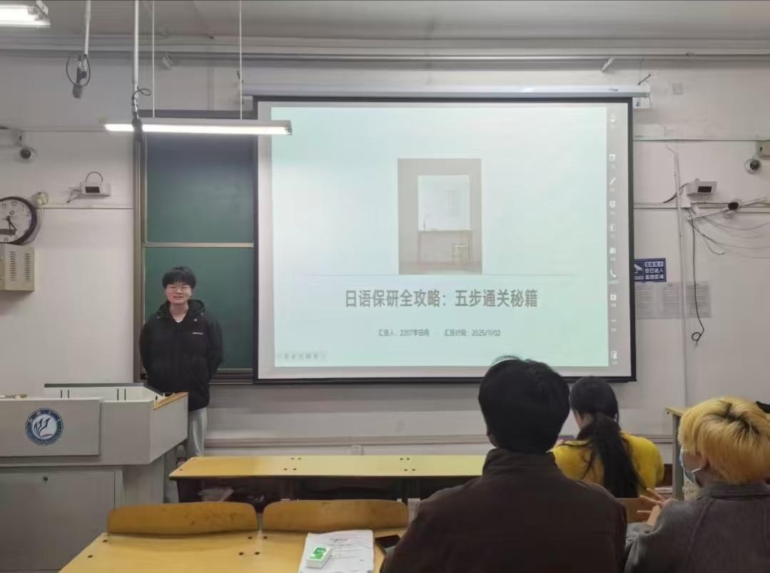 李田阁将备考准备作为此次分享的重点内容,从文书准备、笔试准备、面试准备三个方面分别进行阐述。他以在校期间丰富的实践活动和竞赛经验为引,鼓励学生们积极参与列入竞赛目录的赛事,提高自身的竞争力,为推免文书提供材料,为职业发展积累经验。李田阁还强调自我锻炼的重要性,鼓励学生们在课余时间进行新闻朗读、录音复盘等方式强化训练,并尝试在公共场合进行日语演讲,为面试全程日语问答做准备。