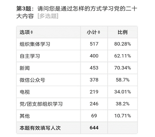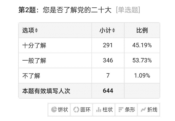 为了更加深刻的认识和了解学生对于党的二十大精神的认识情况和了解情况,进行了大规模的线上的问卷调查,统计了近两个年级的学生对于二十大相关内容的问卷调查情况。