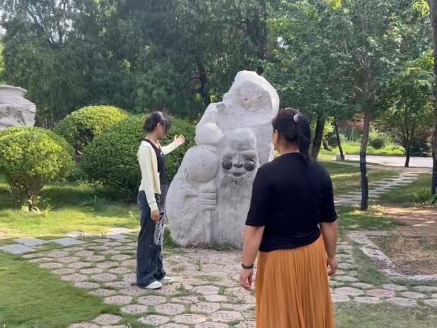 活动现场,实践队成员孟洋化身 “文化讲解员”,以公园历史脉络为线索,向游客生动铺陈东皋公园的岁月故事。从古代文人在此留下的翰墨遗香,到近现代承载的城市集体记忆;从园内古迹的保护性修缮,到特色园林景观的匠心营造,用细腻讲述串联起公园与沂水发展的情感纽带。游客漫步其间,既能饱览景致,更能沉浸式触摸文化传承的肌理。在公园文化互动区,实践队成员主动协助工作人员,引导游客参与民俗体验项目,针对沂水民俗文化、公园游览知识等疑问耐心答疑,保障游览秩序与体验感。