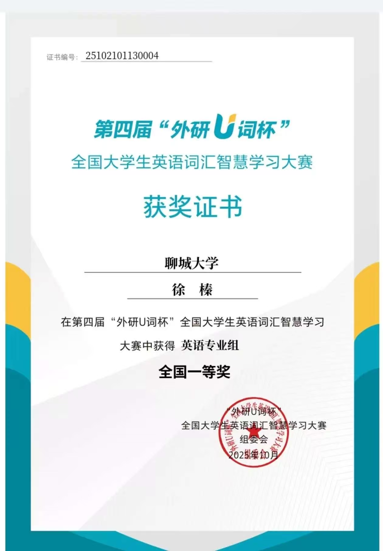 米兰体育网页版徐榛全国大学生英语词汇智慧学习大赛专业组全国一等奖