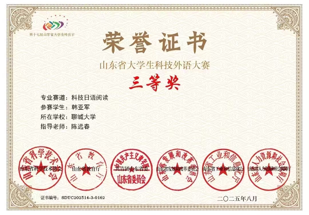 » 韩亚军在山东省大学生科技外语大赛获得三等奖
