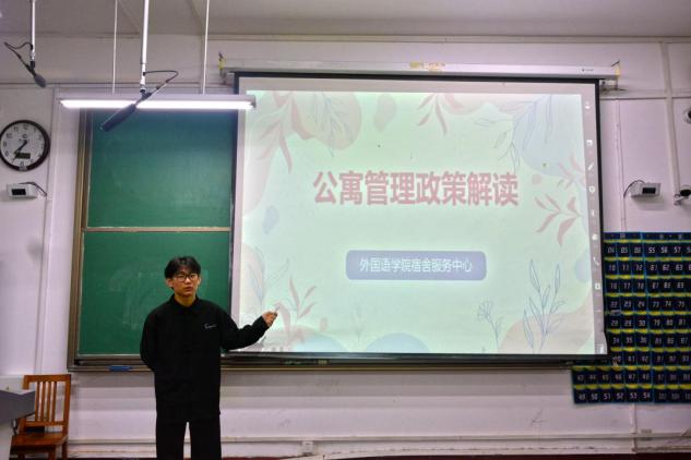 会议伊始,宿舍服务中心周天浩简要概述会议内容,随后围绕晚归、用电安全、卫生等展开详细讲解。他结合具体案例与通俗表达,让舍长们直观理解相关要求,为后续宿舍工作落地打下基础。