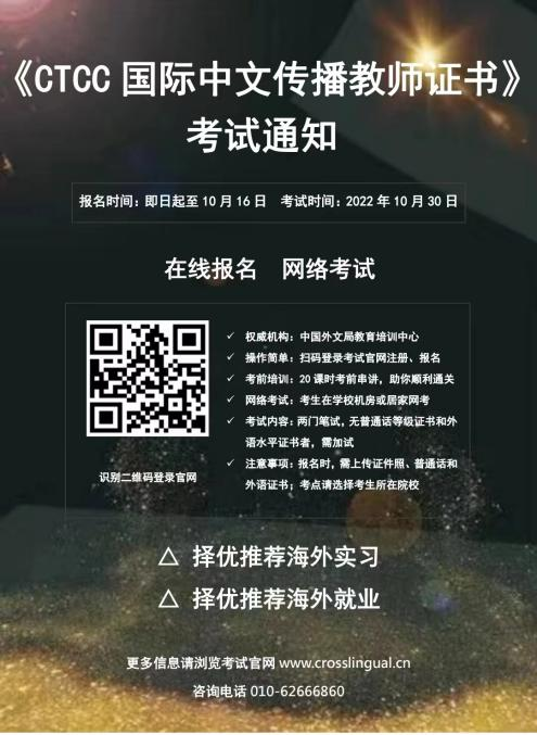 国际中文传播教师证书考试(CTCC)是中国外文局教育培训中心跨语言教学能力测评项目管理中心主办的职业提升性质的标准化考试。考试根据汉语、英语、跨语言教学等学科特点和教学实际需要,对应试者的语言表达与运用能力、文化阐释与传播能力、第二语言教学设计与组织能力、跨文化交际与适应能力、媒介素养与策划能力等五方面能力进行考察,评价应试者是否具备国际中文教学传播能力、能否胜任中华语言文化的跨语言传播工作。欢迎有志于从事中华文化国际传播的人士、有志于从事国际汉语教学的人士、热爱中华语言文化的人士报名参加考试。